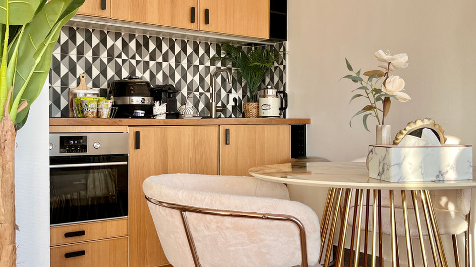 - 엘레베이터 | 태블릿PC(12.1) | 무선인터넷 | 에비앙 생수 2 | 컵라면 2, 짜장라면 2 | 쌀 | 수건 8, 발수건 1 | 오리털 이불/베게 | 침구 일체 (세탁,고온건조) | 휴지,티슈 | 샴푸, 샤워젤,컨디셔너(BIO제품) | 실내화 | 네스프레소 머신, 커피캡슐 | 커피포트 | 쿠스미티 | 청소기 | 에어컨 | 선풍기2 | 난방기 | 전자렌지(오븐 내 기능) | 전기밥솥 | 헤어드라이기 | 세탁기 | 세탁세제 | 빨래건조대 | 다리미/다리미판 | 옷장,옷걸이 | 냉장고(냉동고X) | 냄비, 후라이팬, 식칼, 도마, 식기류 | 소금, 후추, 식용유 | 와인잔, 와인오프너, 샴페인잔, 커피잔, 물컵 -